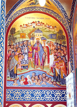Arguably the most significant event in the history of the religion of the Easter Slavs was the “Baptism of Rus”. In approximately 988, Olha’s grandson, Grand Prince Volodymyr the Great (St. Volodymyr) converted to Christianity, married the Byzantine emperors’ sister for dynastic reasons, and also demanded of his entire realm that all people convert to Christianity. Chroniclers state that Volodymyr directed Greek priests to take vast numbers of Kievans into the river and baptise them. Today in Canada, there are many churches named for Volodymyr and Olga, including the metropolitan cathedral for the Ukrainian Catholic Church in Canada and the cathedral for the Western Diocese of the Ukrainian Orthodox Church of Canada.