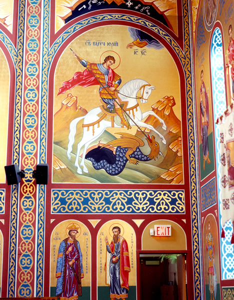 One impressive example of the return to “canonically correct” iconography is St. George Ukrainian Catholic Church in Edmonton. Here there seems to be hardly a square inch of the interior that is not painted with classic iconography or otherwise embellished with stencilling. The iconographer, Heiko Schlieper, set out to create a look that is authentically Ukrainian from the Kievan princely era. The result is most impressive.