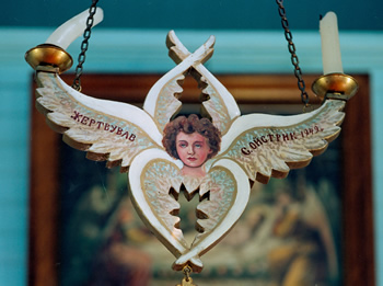 Aside from the archangels, the six-winged seraphim are very popular in Ukrainian iconography. Scripture informs us that they are positioned close to their Creator and the prophet Isaiah wrote: “Above him were seraphs, each with six wings: With two wings they covered their faces, with two they covered their feet, and with two they were flying.” (Isaiah 6:2). Seraphim resemble fire and the word actually means “enflamed” in Hebrew. Perhaps this is why we often see the image of a seraphim on the eternal light placed before the iconostas in Ukrainian churches.
